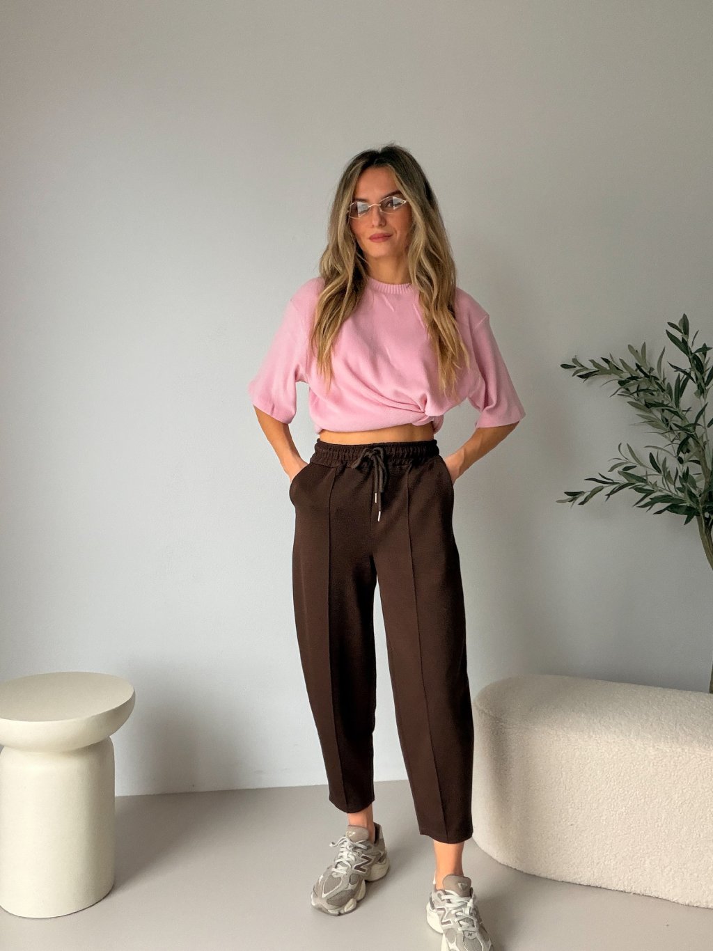 Objev moderní interpretaci ležérní elegance s těmito hnědými baggy kalhotami s puky CALIS. Volnější střih s širšími nohavicemi, které se směrem dolů zužují, vytváří unikátní siluetu, která lichotí postavě a zároveň zaručuje absolutní pohodlí. Trendy outfitu docílíš, když kalhoty doplníš k lodičkám na vysokém podpatku. Elastický pas s gumovým patentem se perfektně přizpůsobí tělu, zatímco praktické boční kapsy dodávají outfitu uvolněný, městský styl. Hnědá barva působí elegantně a snadno se kombinuje. Tyto kalhoty jsou ideální volbou pro ženy, které chtějí být stylové, ale bez kompromisů v pohodlí.