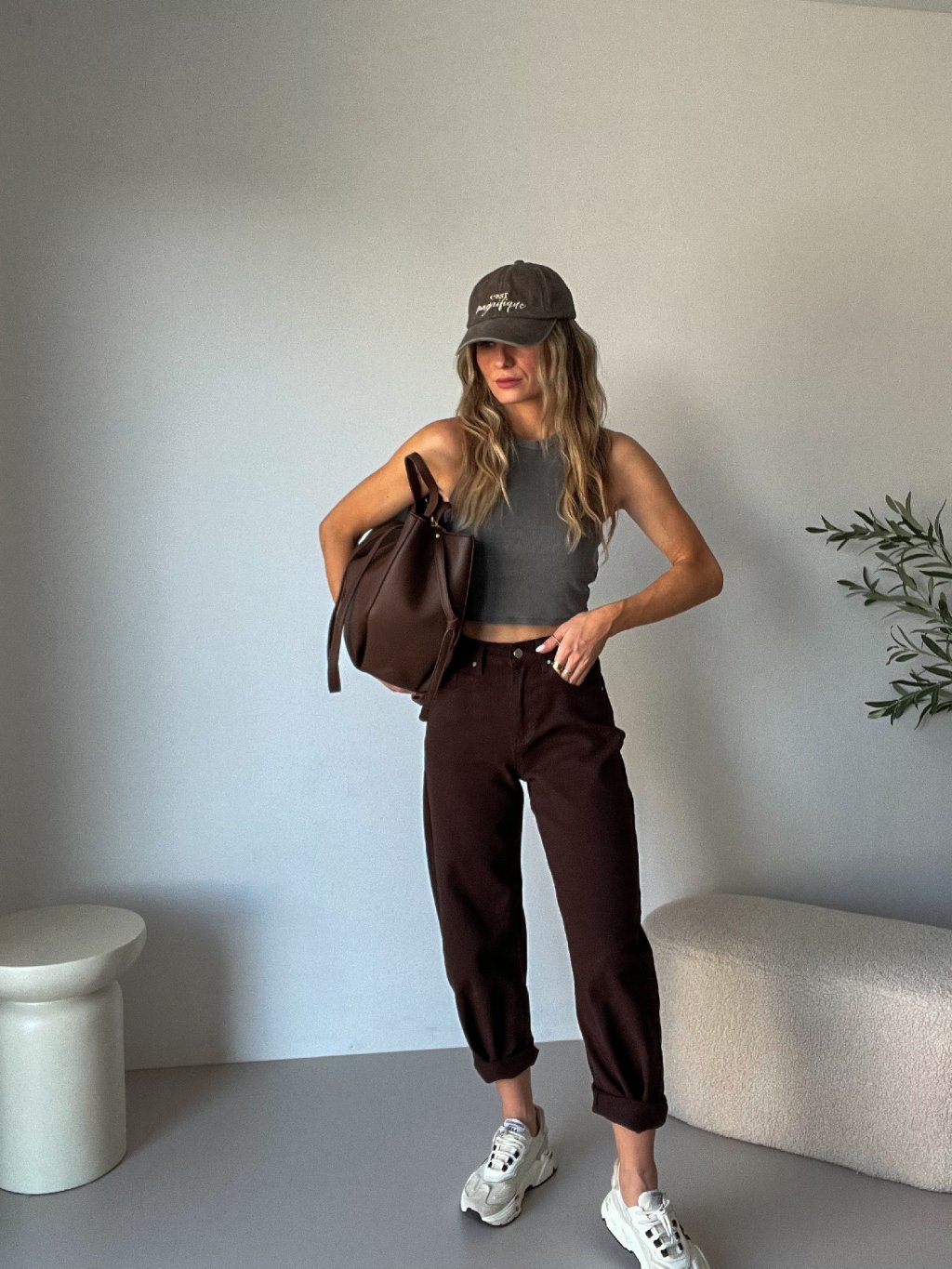 Hnědé balonové džíny LABEL jsou trendy kousek, který si zamiluješ na první obléknutí. 🤎 Mají vysoký pas, který krásně tvaruje postavu, a balonový střih, díky němuž působí moderně a zároveň jsou maximálně pohodlné. Boční i zadní kapsy dodávají praktičnost a lehce strečový materiál se přizpůsobí pohybu i celodennímu nošení. Pohodlný střih, příjemný materiál a nadčasová hnědá barva z nich dělají ideální džíny pro každodenní outfity – skvěle se kombinují s pleteninami, sakem i jednoduchým topem. Styl a komfort v jednom ✨