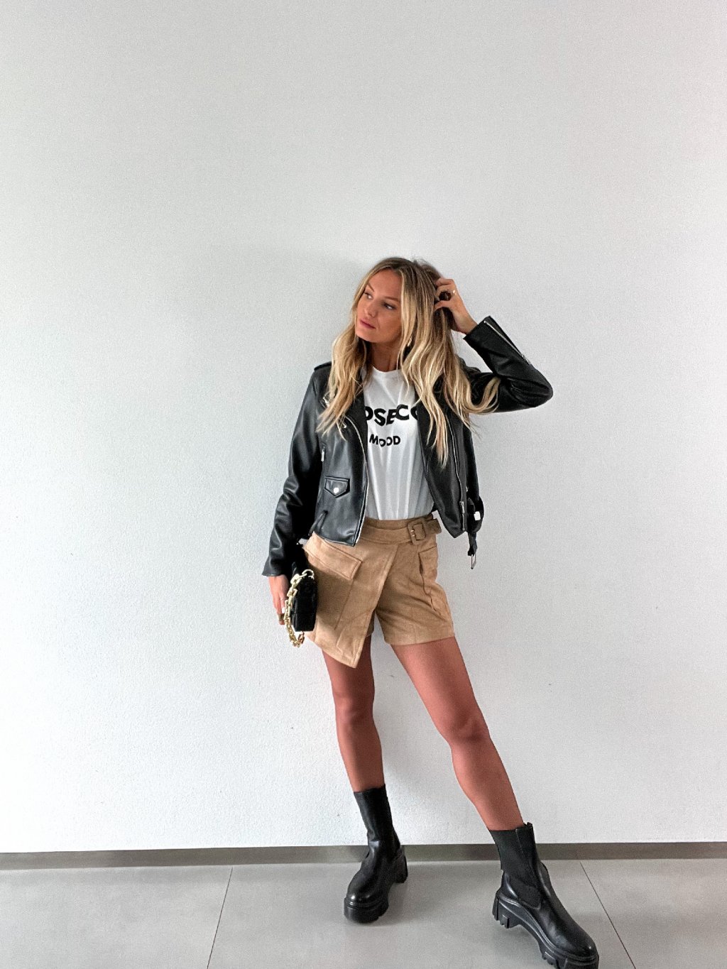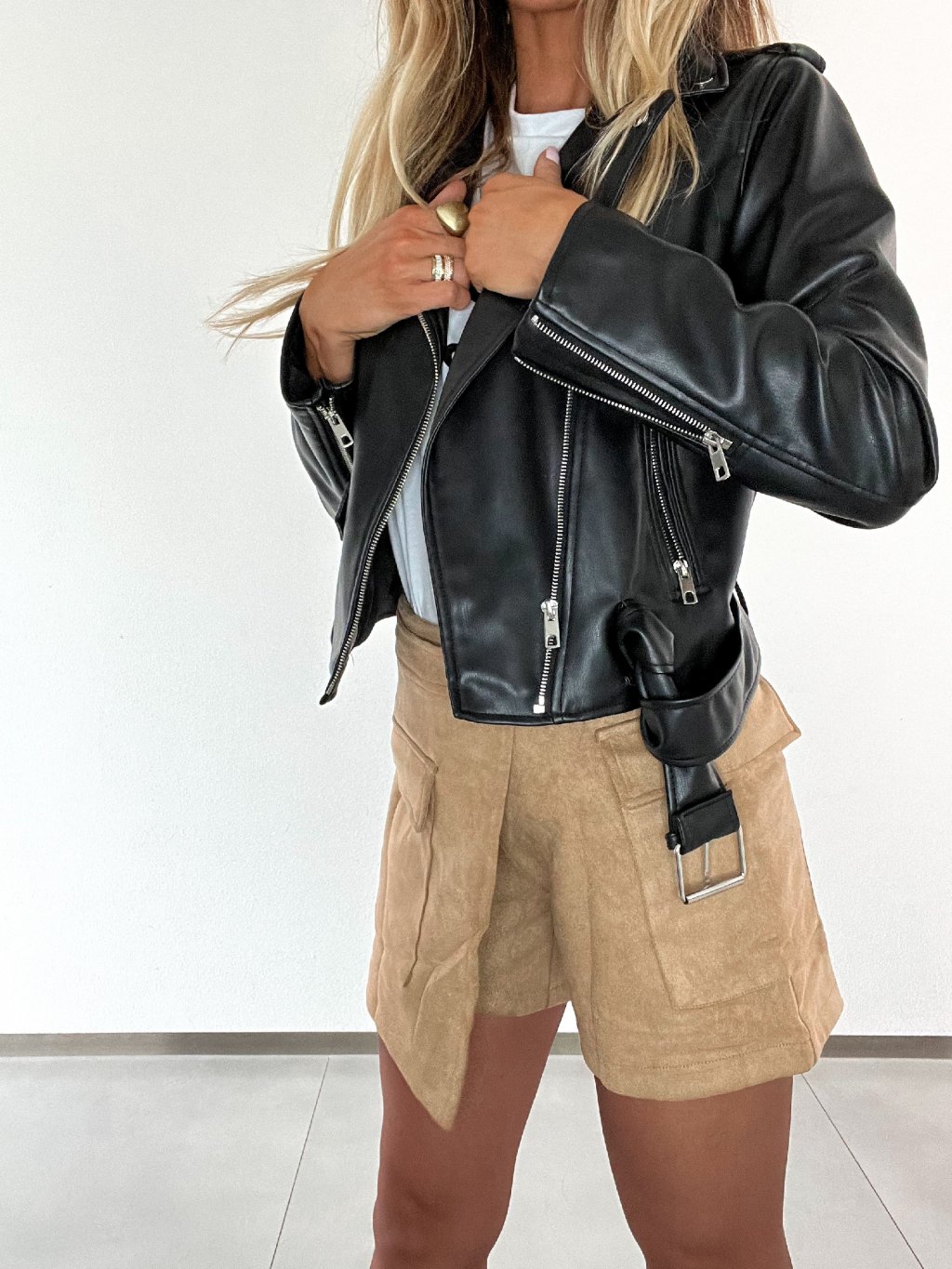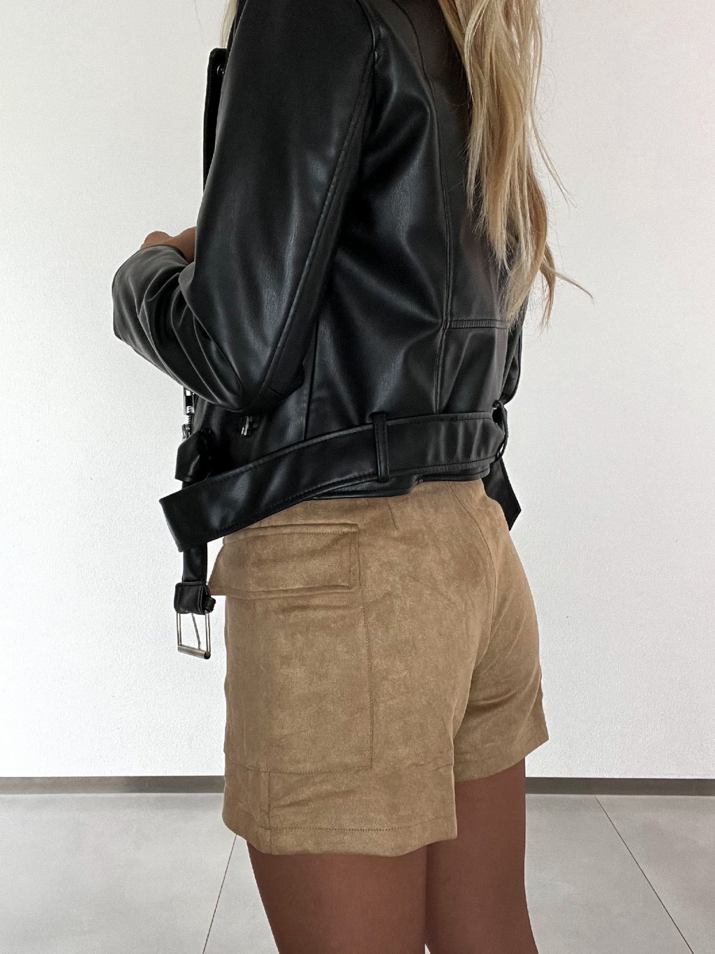 Béžové semišové kraťasy UNIQUE v originálním střihu s bočními kapsami, doplněné páskem.