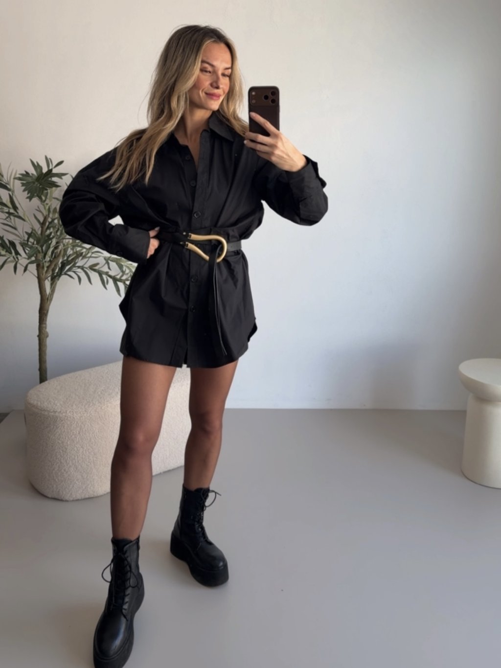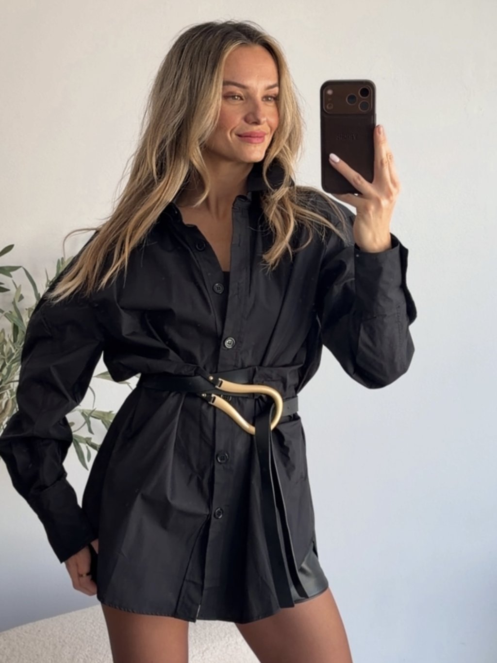 Černá oversize košile s koženým páskem, dlouhý rukáv. Pásek je pevně přišit ke košili. Košile má prodloužený střih.