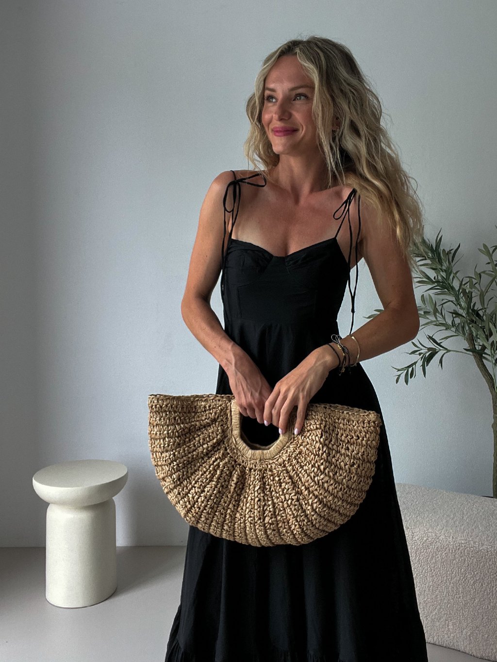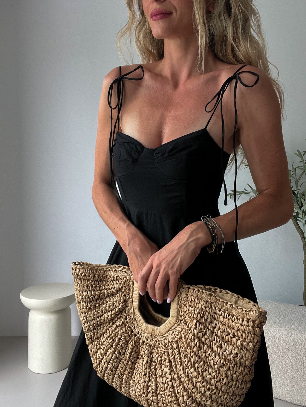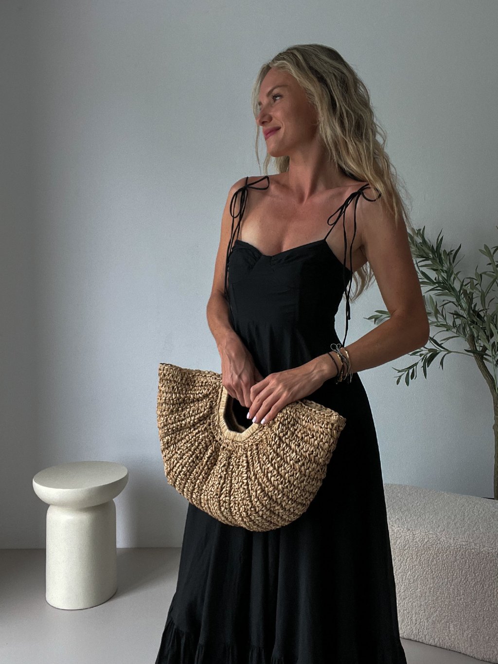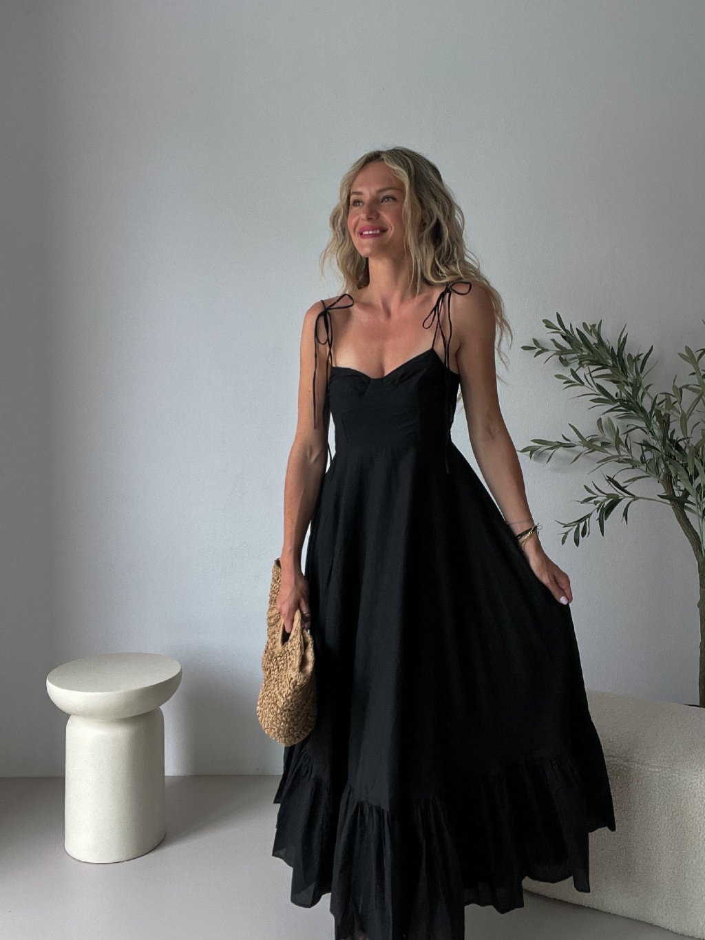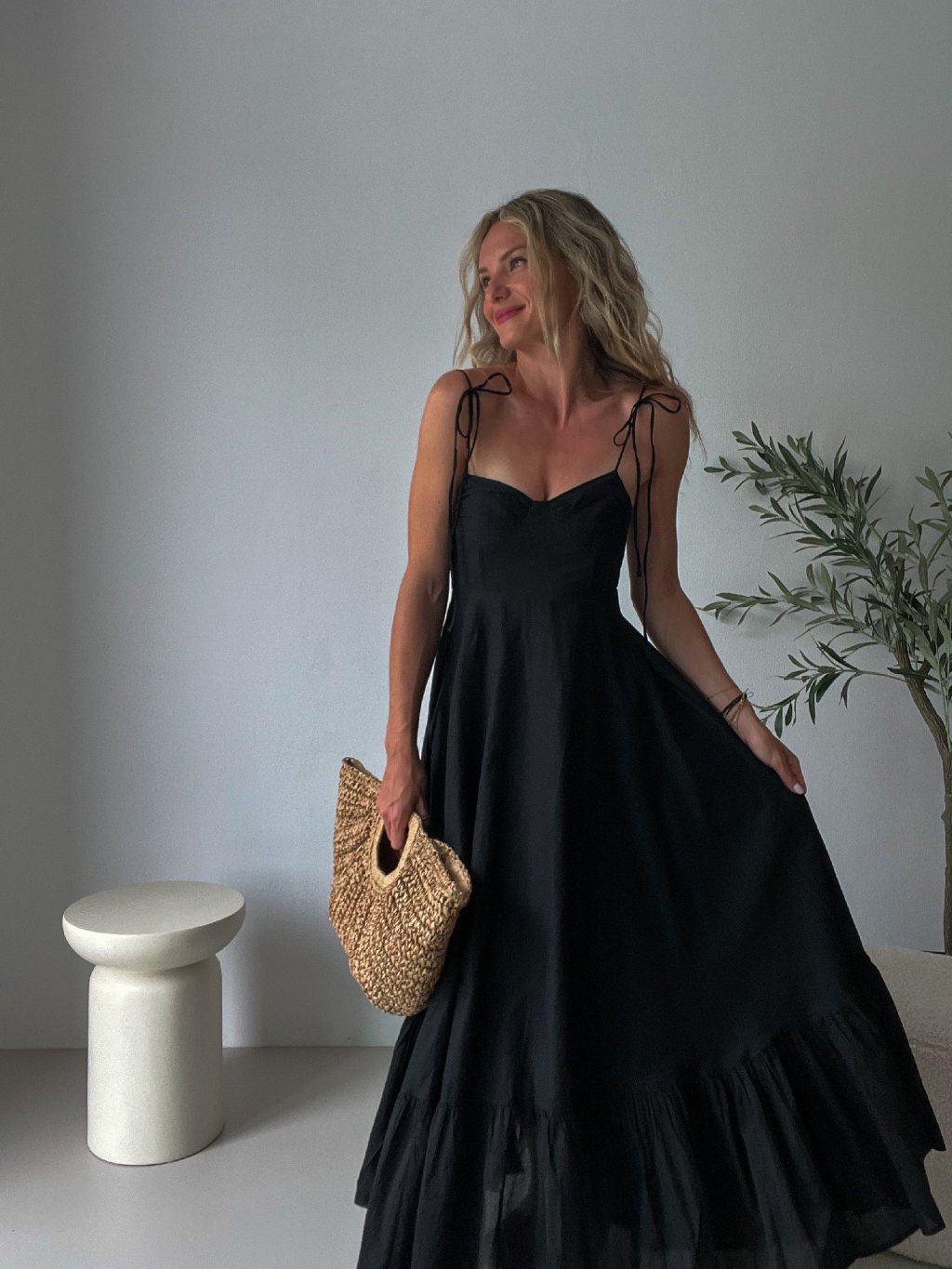 Lehké, vzdušné a smyslně ženské – tyto černé maxi šaty LUIGI s jemnými ramínky na zavazování jsou ztělesněním letní elegance. Volný, splývavý střih lichotí každé postavě a dodává pocit absolutní volnosti. Rafinovaný výstřih a romantický volánový lem se postarají o to, že se v nich budeš cítit jako bohyně – ve městě, na pláži i na večírku pod hvězdami. Nádherné, elegantní šaty na léto!