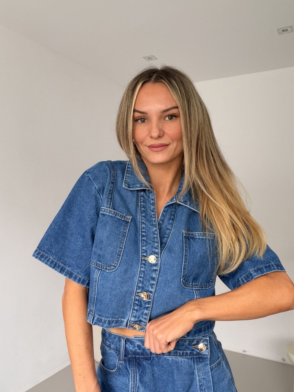 Denim crop košile BELLUCI je must-have kousek, který dodá outfitu ten správný fashion vibe. Kratší střih perfektně ladí se skort sukní BELLUCI a společně vytváří dokonale sladěný set, který působí moderně a sebevědomě. Tmavý denim dodává košili sofistikovaný nádech, zatímco kvalitní, pevnější džínovina krásně drží tvar. Krátký rukáv zajišťuje pohodlí i v teplejších dnech a dělá z ní ideální kousek pro každodenní nošení. Výrazné zlaté knoflíky jsou detail, který celý look povyšuje a dodává mu jemný luxusní akcent. Nosit ji můžeš jako set nebo samostatně – vždy ale vytvoří outfit, který působí stylově, čistě a naprosto effortless. 💙✨