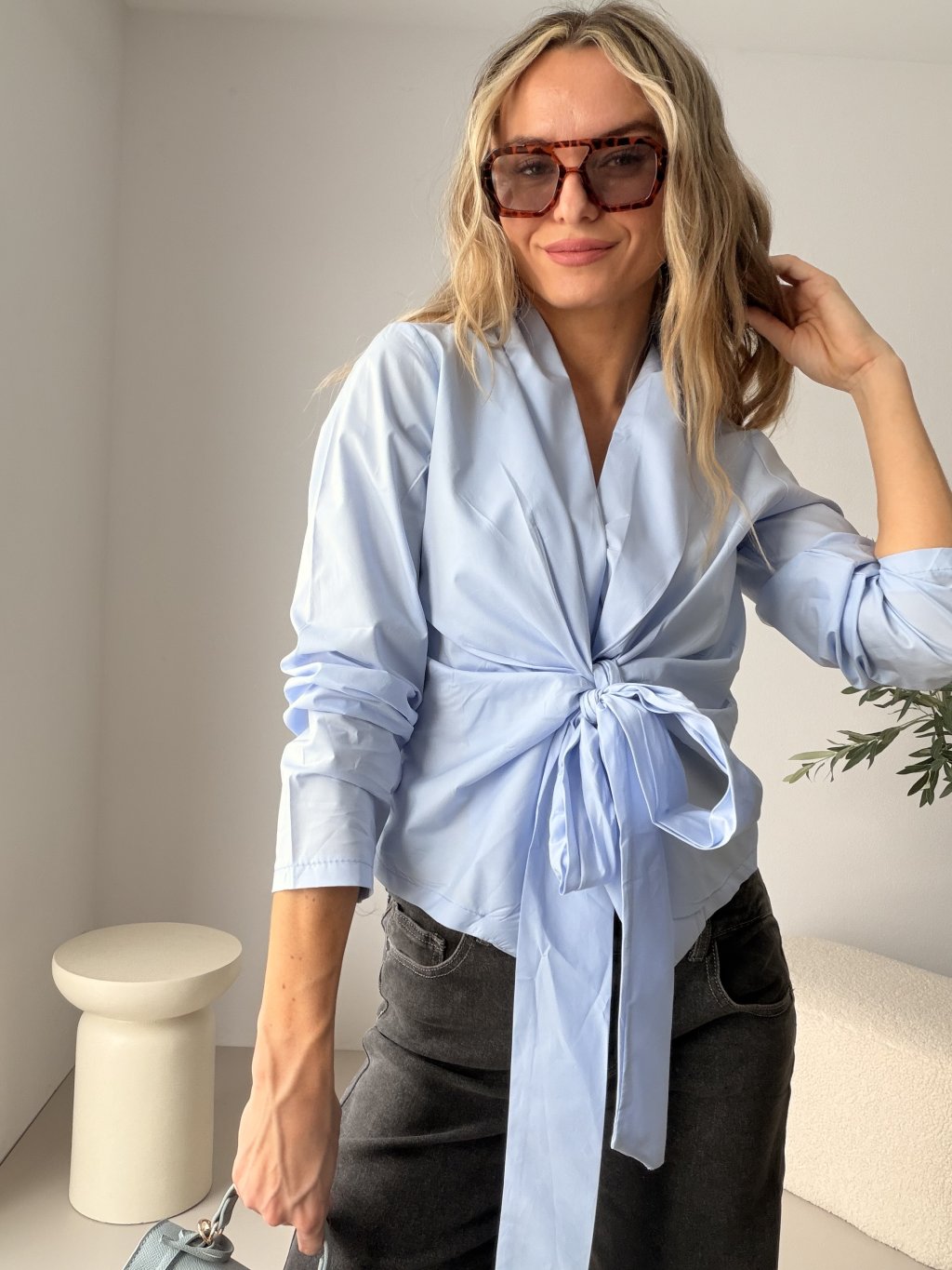 Elegantní košile s mašlí DOLL je kousek, který dodá tvému outfitu jemnou ženskost a nádech luxusu. Má dlouhý rukáv, díky kterému působí velmi sofistikovaně a zároveň je pohodlná na nošení. Dominantou je stylová mašle v pase, kterou můžeš nechat volně splývat nebo ji uvázat do výrazného detailu. Košile se skvěle hodí jak do práce, tak i na večeři nebo společenskou událost – stačí ji zkombinovat s kalhotami s vysokým pasem, sukní nebo sakem a máš hotový elegantní outfit během pár vteřin.