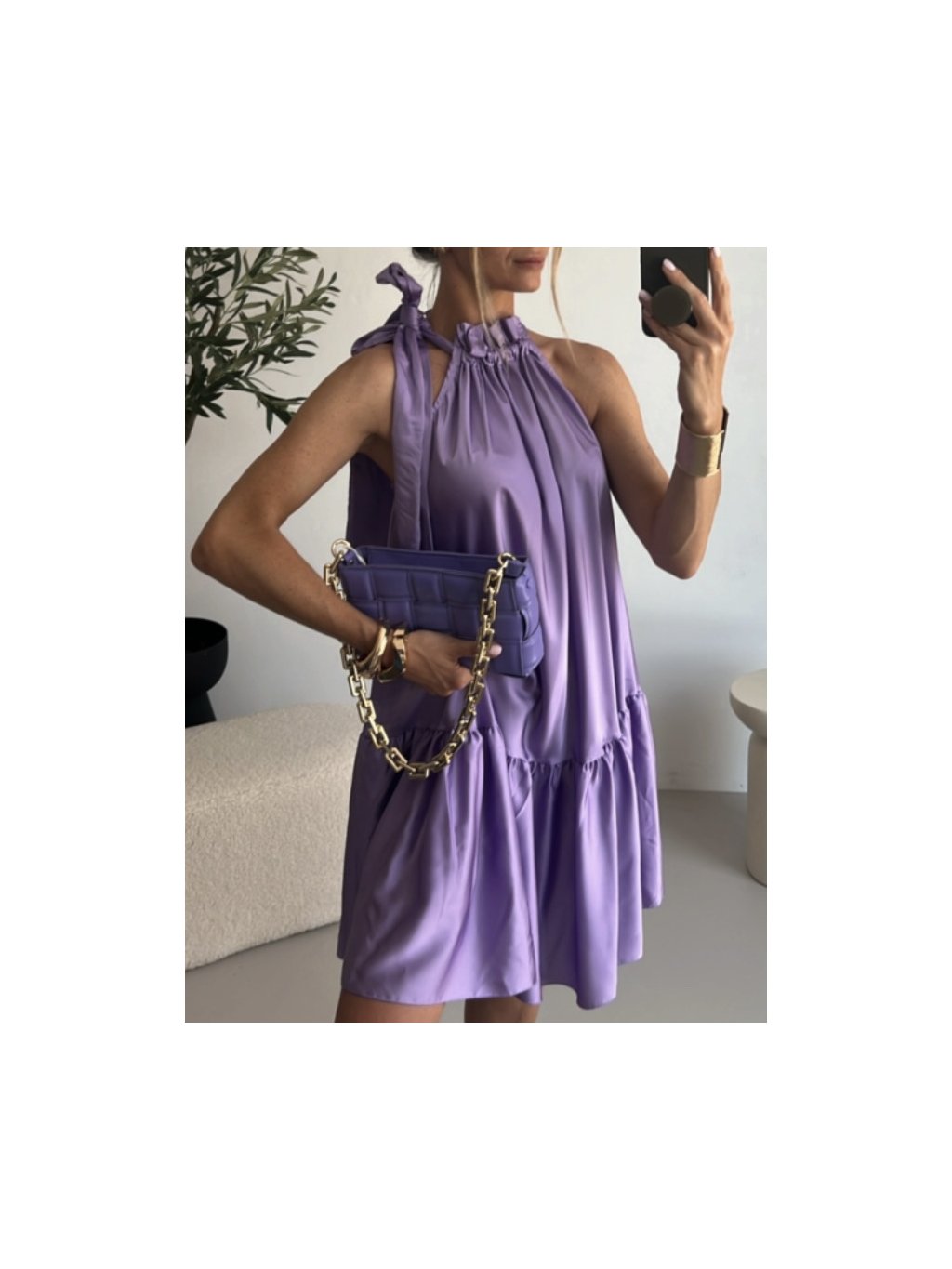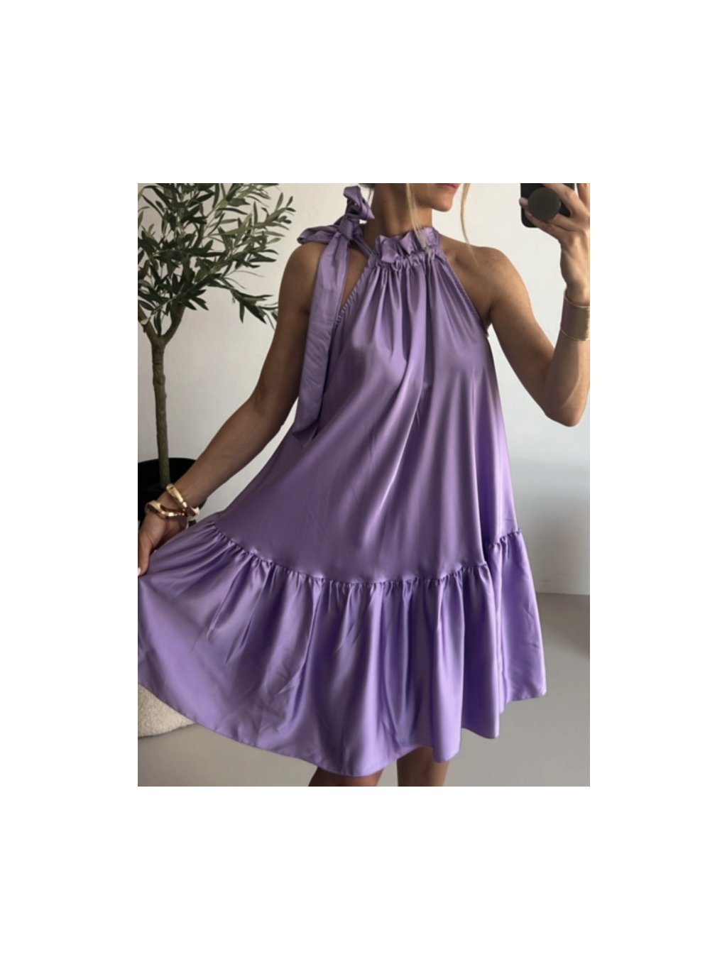 Saténové šaty v krásné letní fialkové barvě. Vázání kolem krku - můžete uvázat na uzlík nebo mašli. Střih do "Áčka". Pokud chcete změnu, můžete šaty převázat páskem (pásek není součástí).