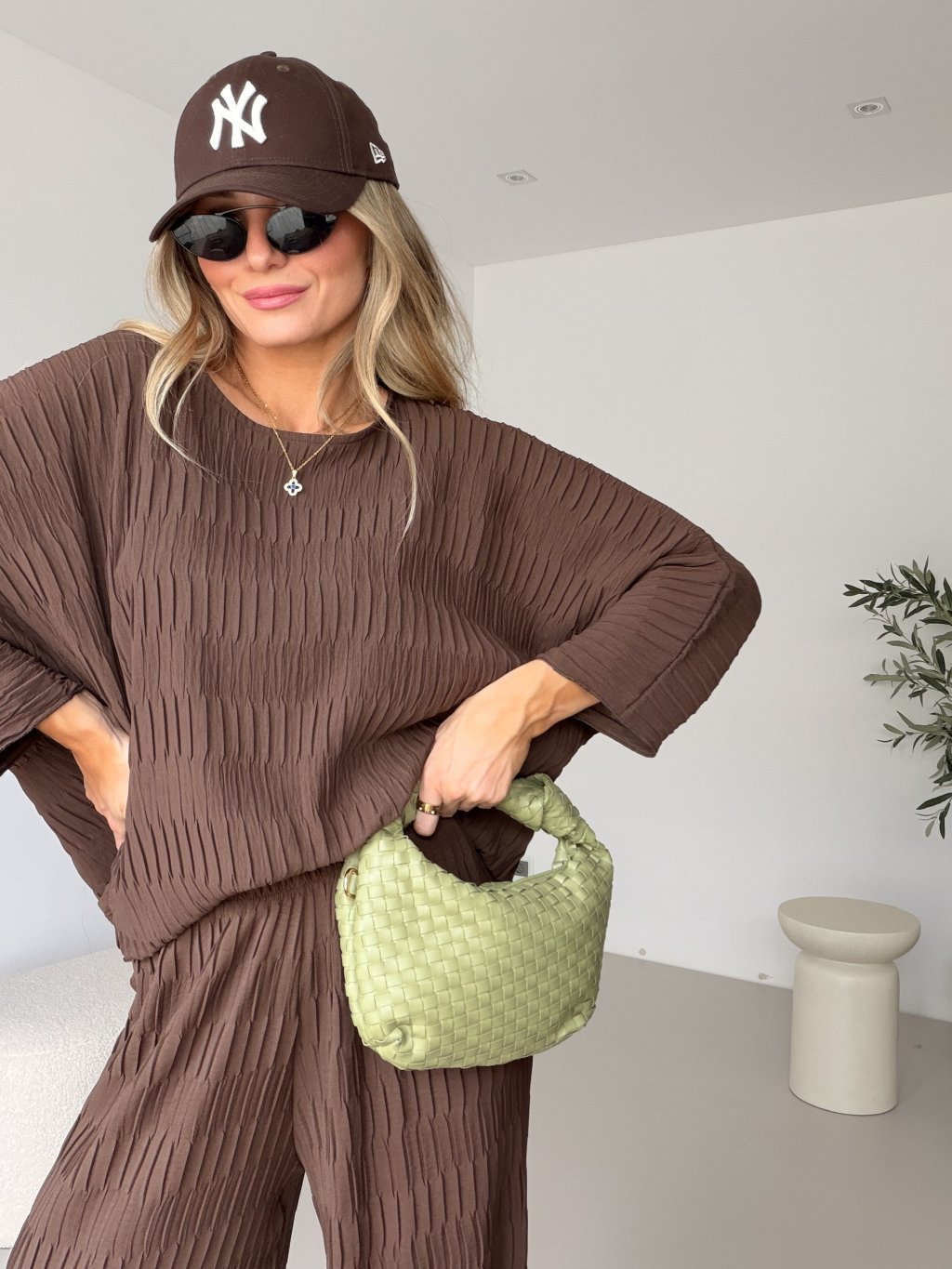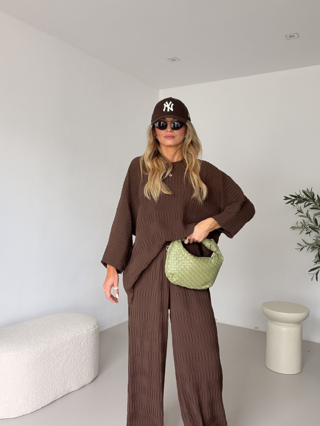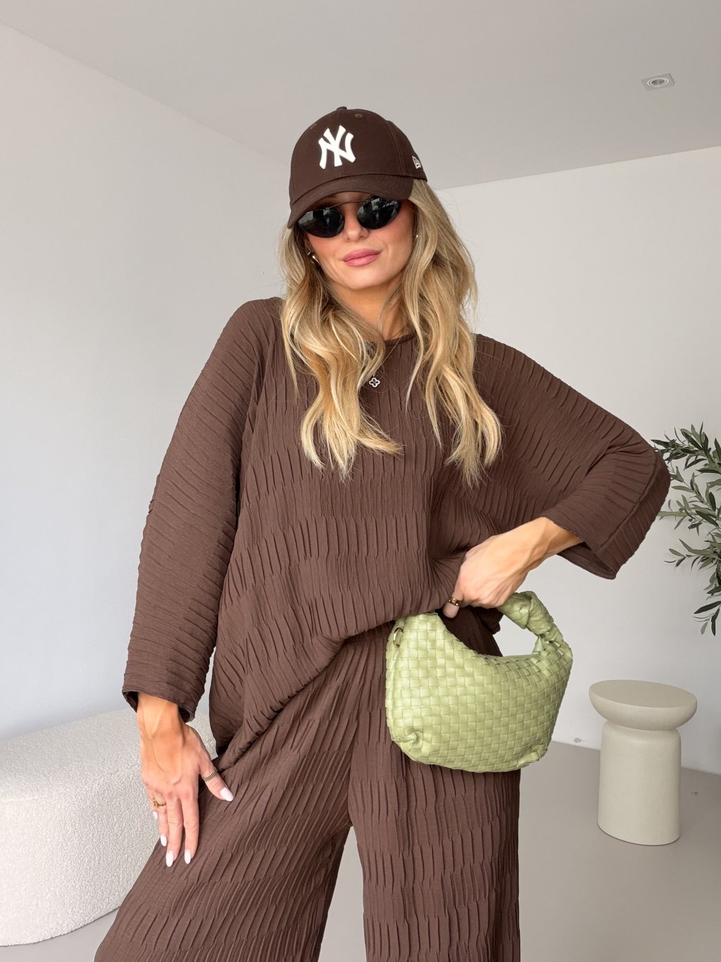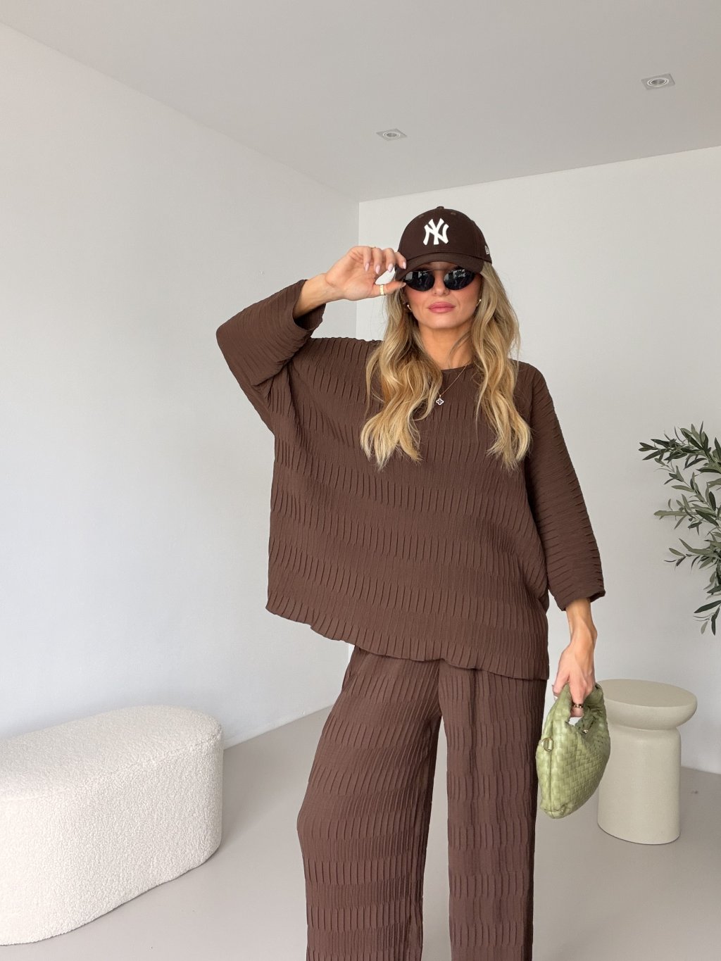 Volnost, kterou ucítíš na první obléknutí. Hnědý volnočasový komplet OLIVE je přesně ten outfit, po kterém sáhneš, když chceš vypadat stylově – ale cítit se jako v druhé kůži. Měkký top s oversize střihem a ¾ rukávem působí ležérně, přesto promyšleně. Kalhoty s pružným pasem krásně sedí a díky volným nohavicím působí elegantně, i když jde o volnočasový kousek. Zemitý hnědý odstín navíc sluší každé barvě pleti a skvěle ladí s béžovou, černou i bílou. Nos ho s teniskami pro uvolněný look nebo s mokasínami a výraznými šperky, když chceš dodat outfitu městský twist.