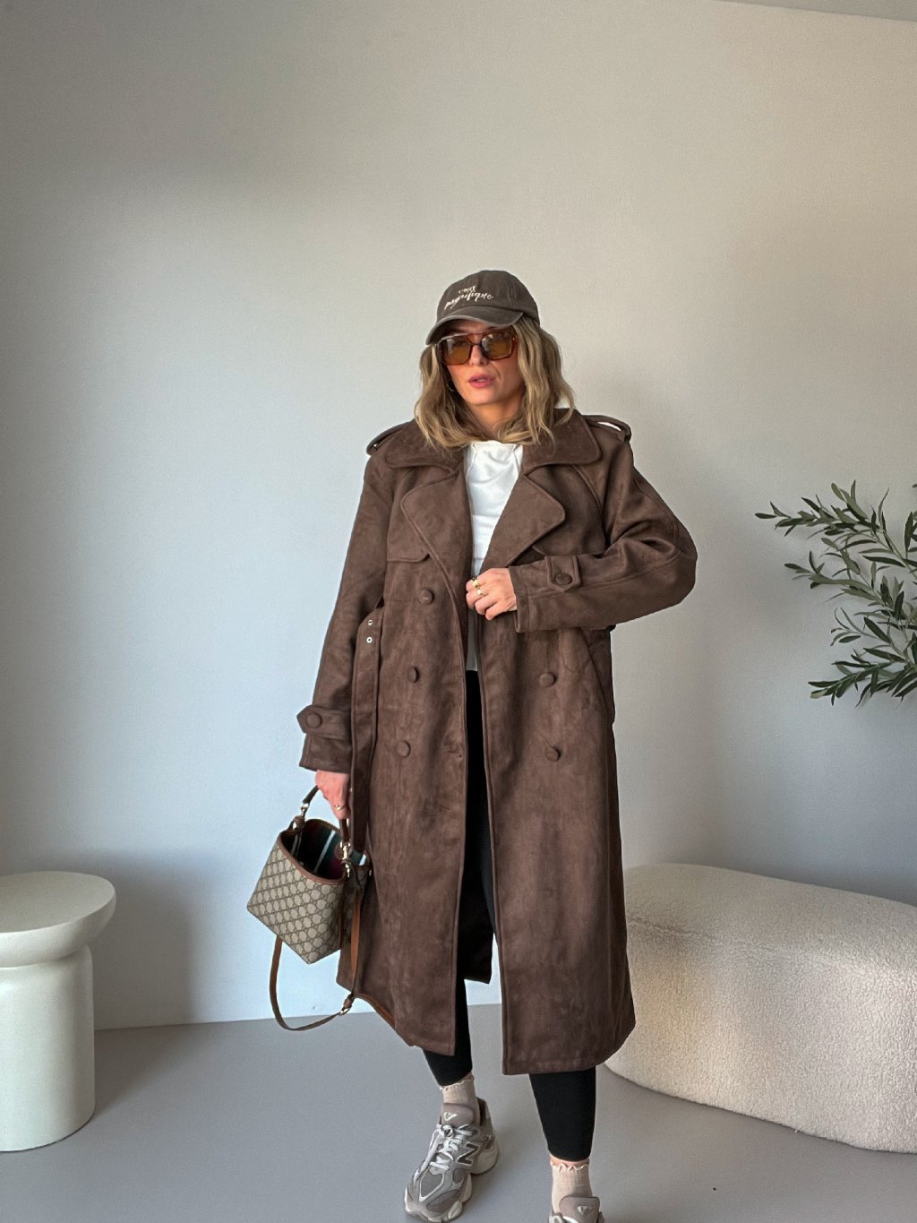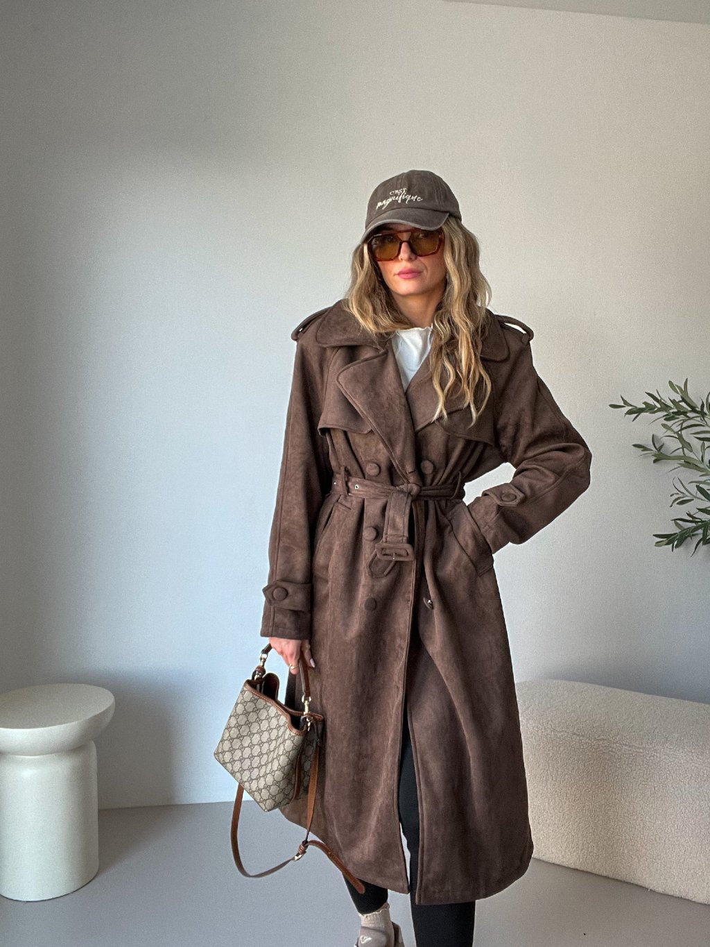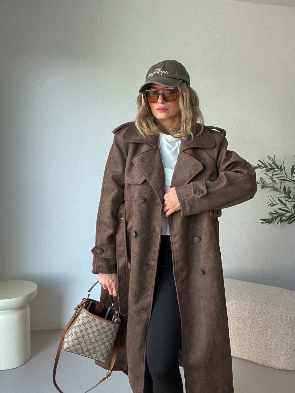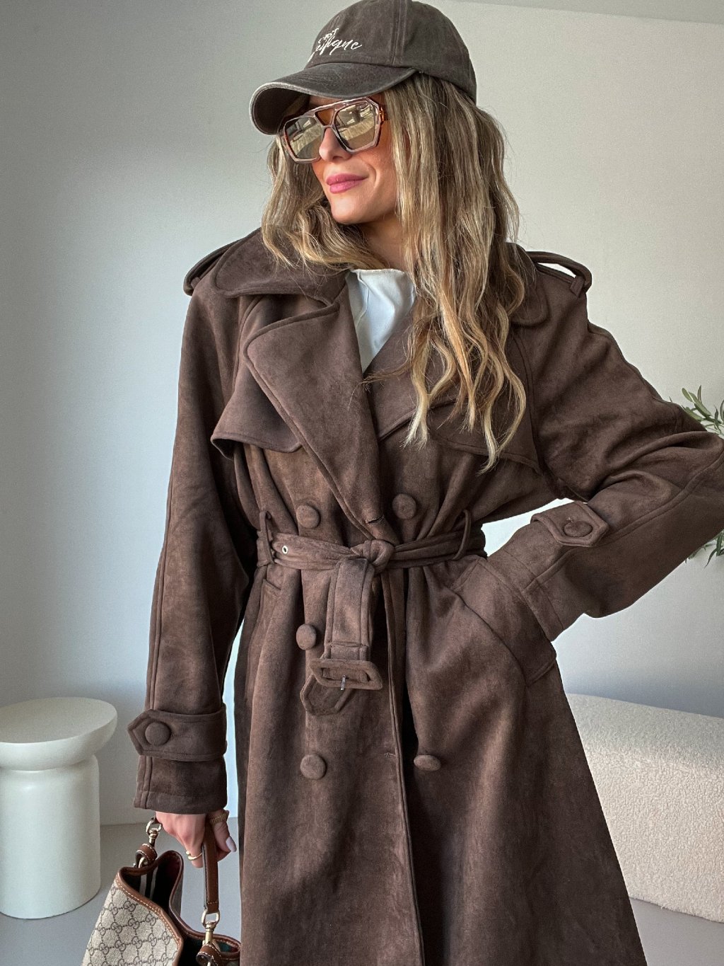 Má elegantní dvojitou klopu, ramenní vycpávky pro krásnou siluetu a pásek v pase, díky kterému si ho můžeš stáhnout přesně podle sebe. Přední kapsy dodávají praktičnost a podšívka zajistí komfort při nošení. Nádherný, kvalitní semišový materiál působí luxusně a v trendy hnědé barvě se skvěle kombinuje s béžovou, krémovou, černou i džínovinou. Nadčasový, ale zároveň výrazný kabát, který se stane hlavním kouskem tvého šatníku ✨