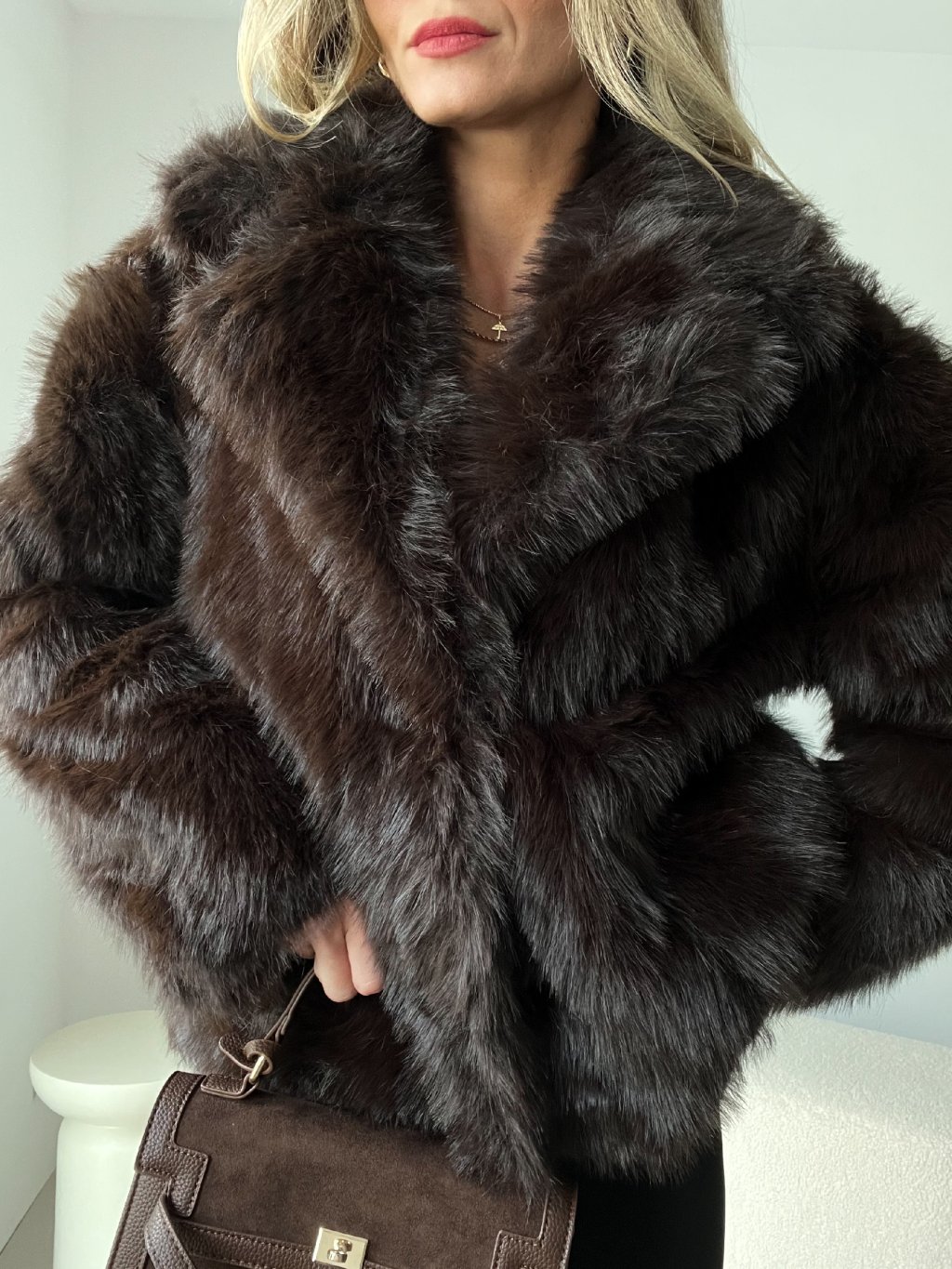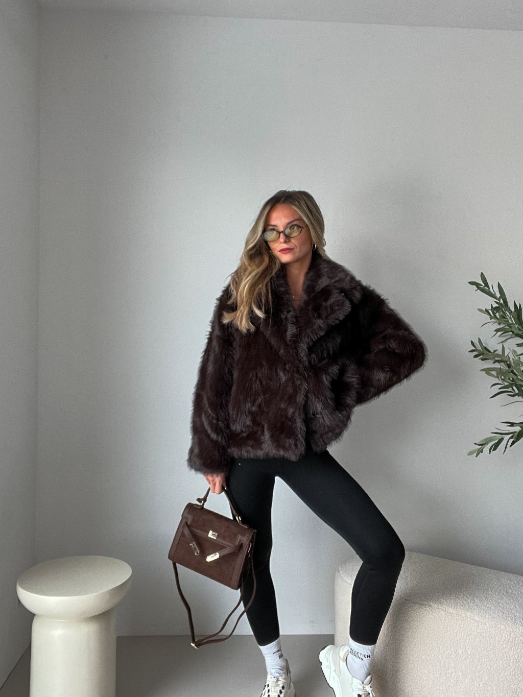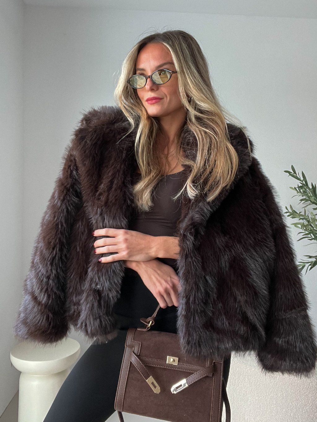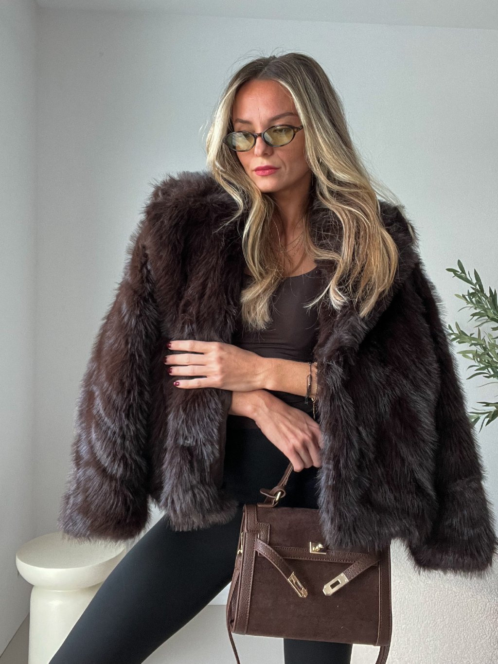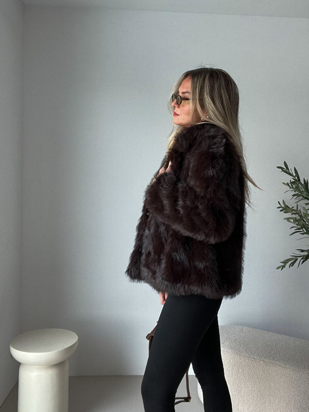 Dámský kožíšek COSY v nádherné čokoládové barvě. Krátká kožíšková bunda s dlouhým chlupem, vysokým stojáčkem/velkým límcem, zapínání na kovový knoflík. Nádherná bunda, která vypadá skvěle například k modrým džínům, černý kalhotám nebo k pletenému kompletu. Krásný a originální kousek, ve kterém budeš nepřehlédnutelná!