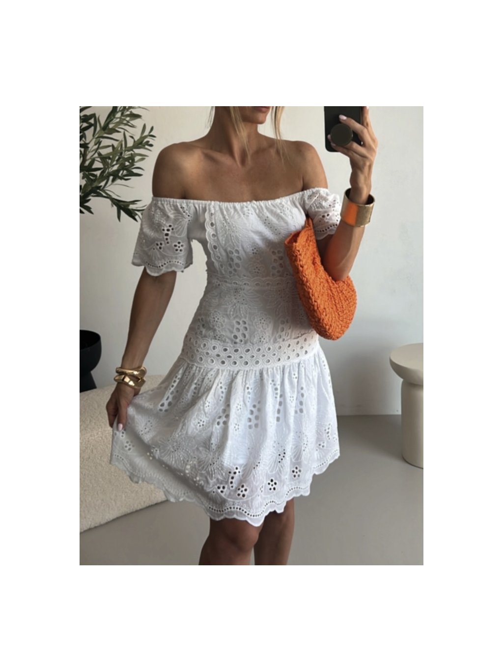 Krásné letní šaty z madeiry v bílé barvě. Sukně áčkového střihu. Variabilita rukávů - mohou se nosit klasicky na ramenou, nebo je lze stáhnout z ramenou.