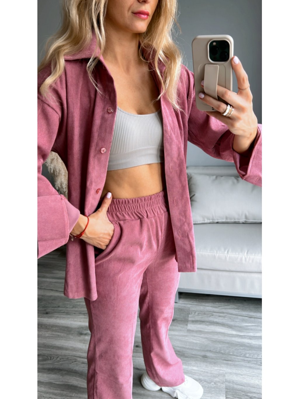Tmavě růžový komplet z manšestrového materiálu. Volné zvonové kalhoty a košile.