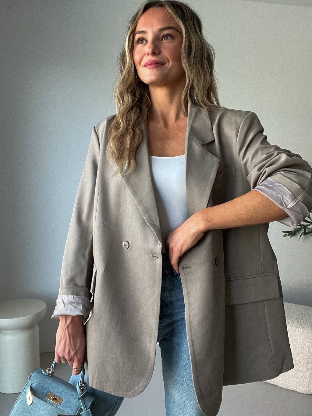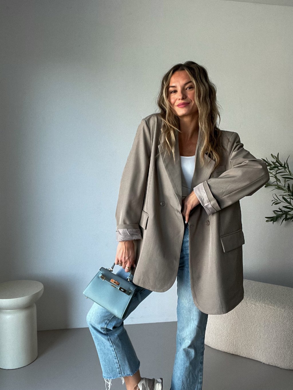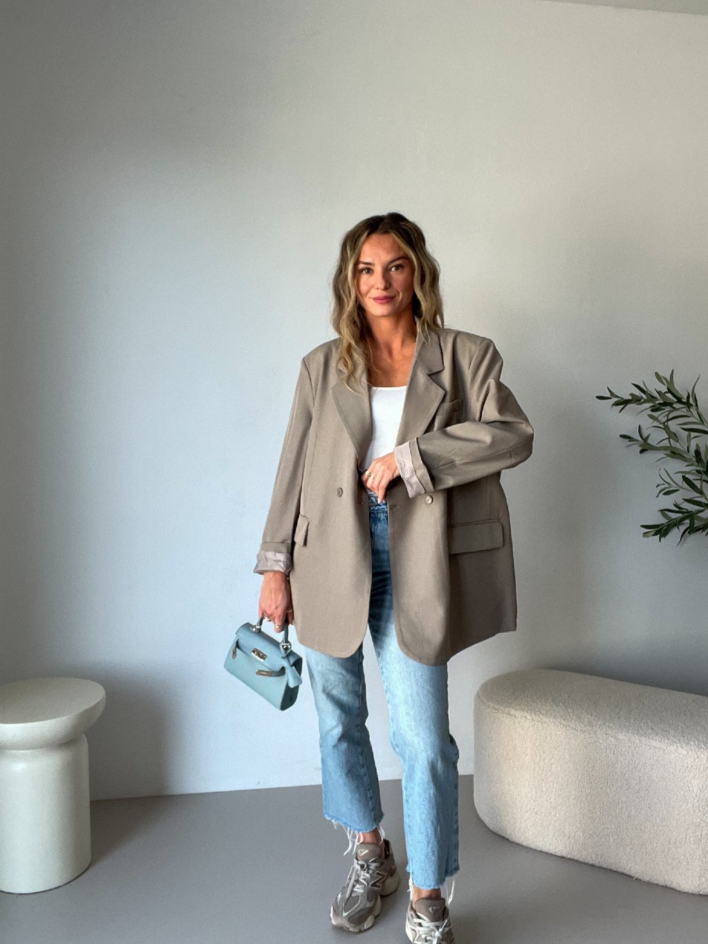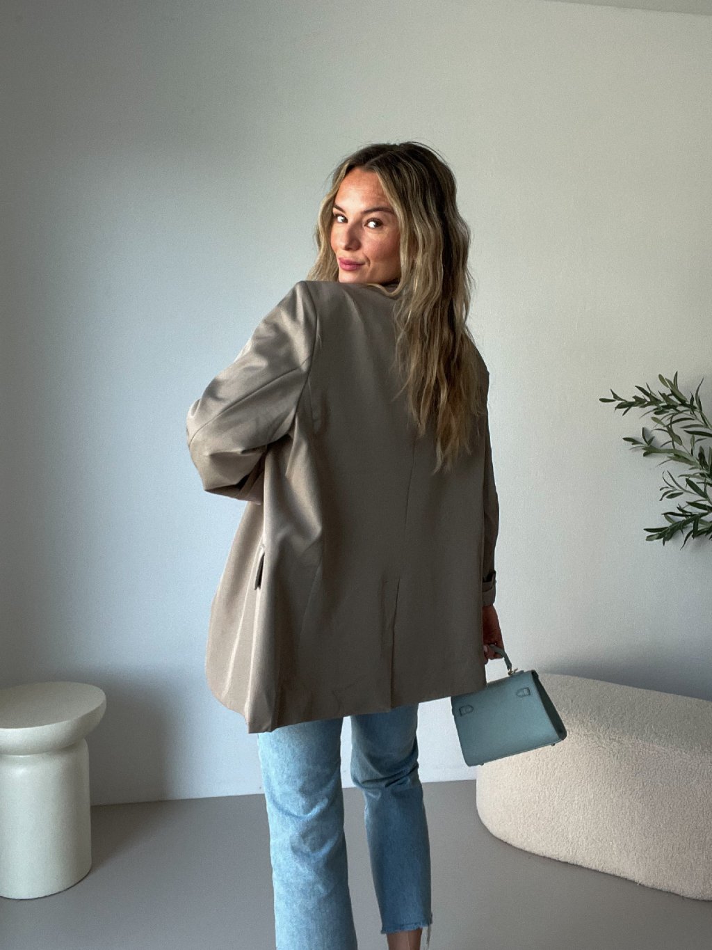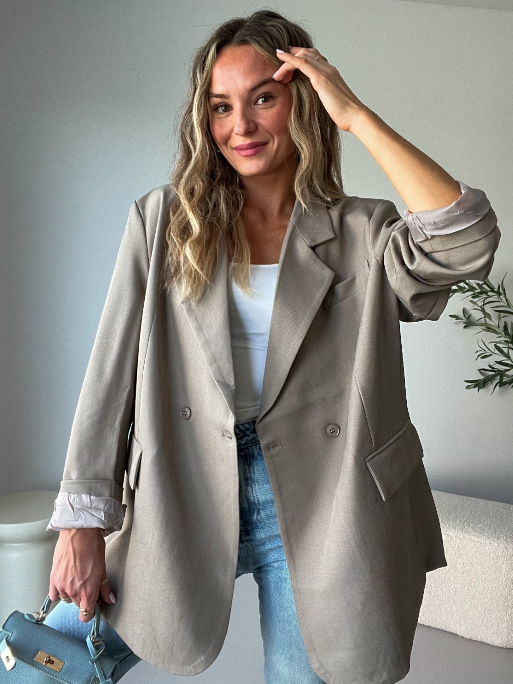 Oversize sako MESSO v elegantní taupe (béžovo-šedé barvě) je nadčasový kousek, který by neměl chybět v žádném šatníku. 🖤