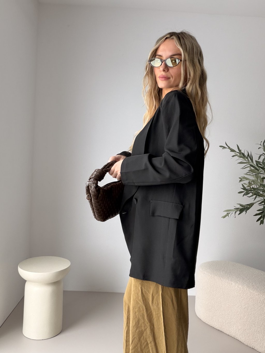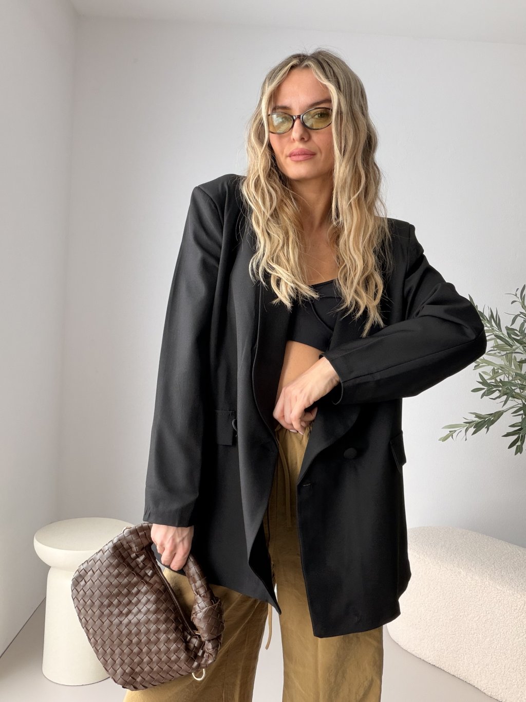 Je ušité z lehkého materiálu, díky ramenním vycpávkám krásně drží tvar a díky oversize střihu působí moderně a ležérně zároveň. Dvojité zapínání na knoflíky dodává saku elegantní, lehce pánský vibe. Skvěle se kombinuje s džínami, kalhotami i šaty a snadno z něj vytvoříš outfit do práce i na večer. Elegantní basic, který unosíš celý rok ✨