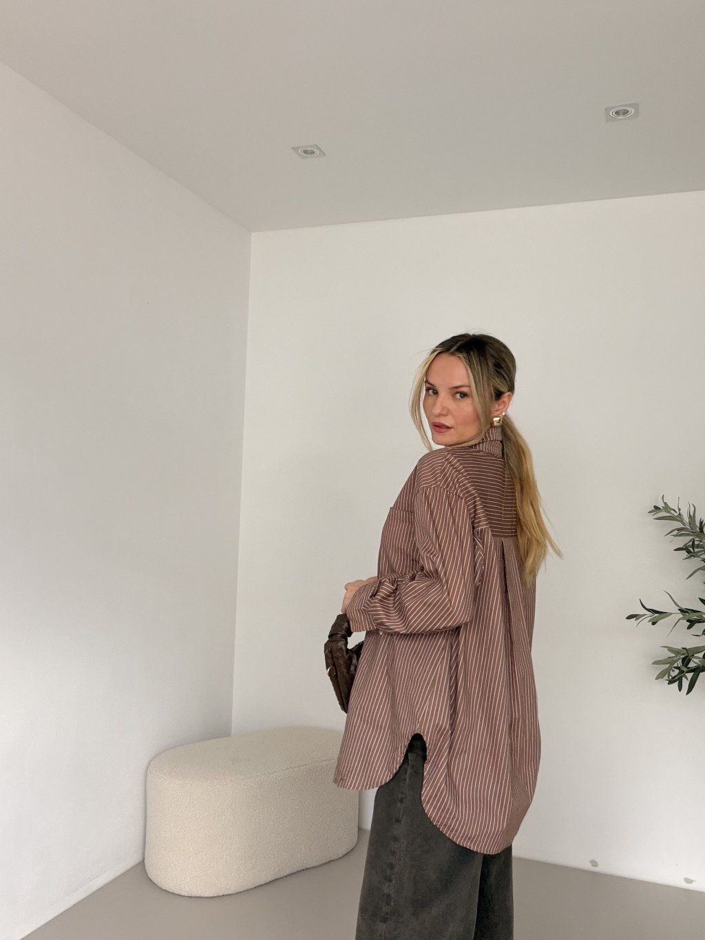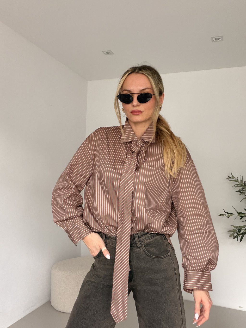 TIE je košile, která si hraje s klasikou – a dělá to dokonale. Proužkovaný vzor v hnědé barvě působí elegantně, ale díky oversize, širokému střihu získává celý kousek uvolněný, moderní charakter. Dlouhý rukáv podtrhuje nadčasový look, který snadno zakomponuješ do každodenního outfitu. Dominantou je "kravata", která dodává košili originální twist – můžeš ji nechat volně splývat nebo ji uvázat podle nálady a vytvořit tak pokaždé trochu jiný styl. Ležérní, stylová a jiná. 🤎✨