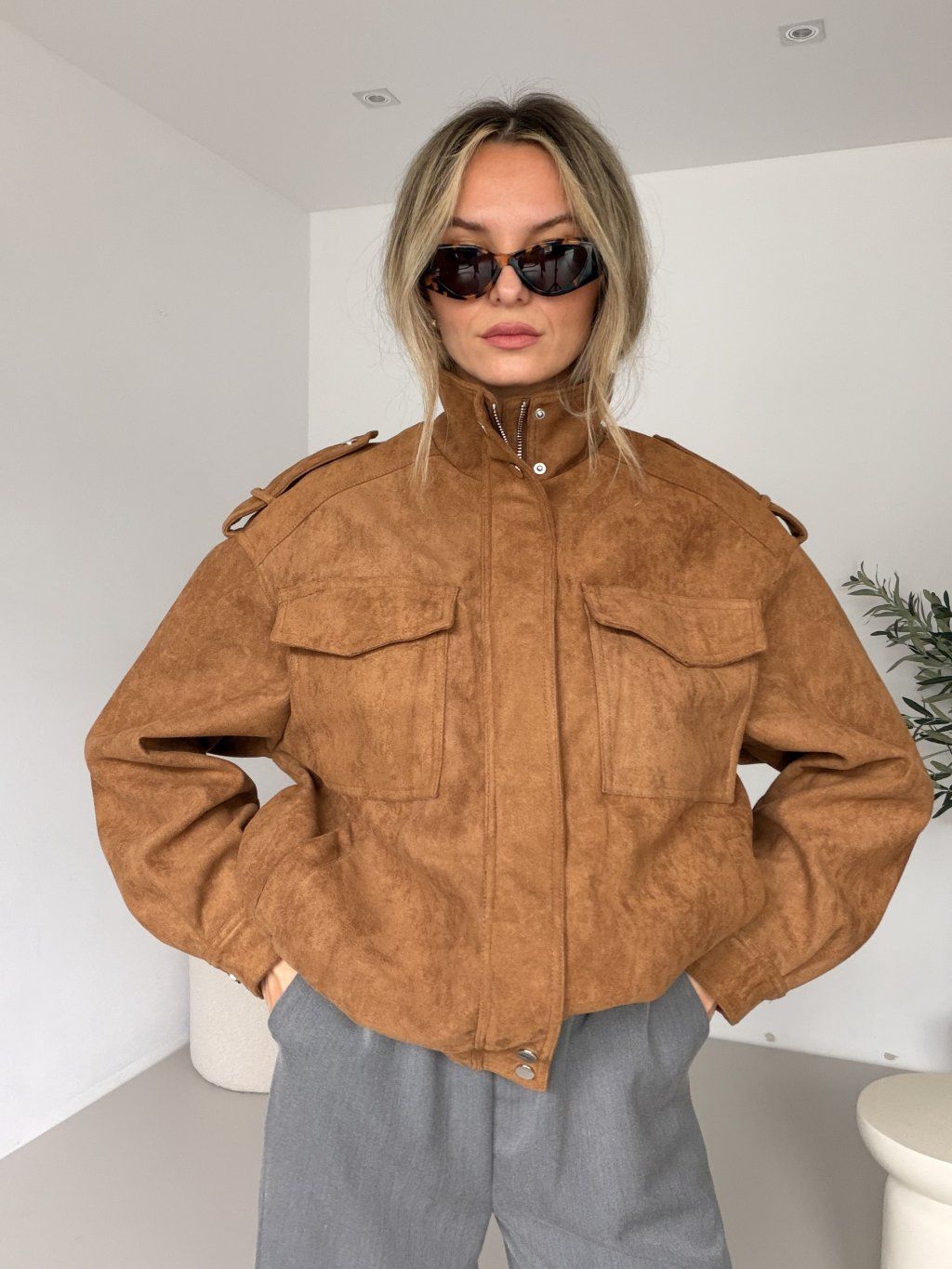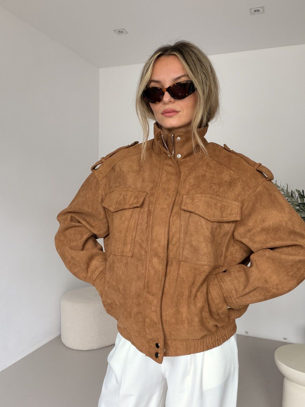 CIAO je bunda, která mluví za tebe – nenápadně, ale s jasným stylem. Semišový vzhled v camel barvě působí luxusně a přirozeně elegantně. Jemný, na dotek příjemný materiál dodává celému kousku sofistikovaný nádech, zatímco střih zůstává pohodlný a snadno kombinovatelný. Zapínání na zip a stojáček až ke krku vytváří čistou, moderní siluetu a zároveň tě ochrání v chladnějších dnech. Výrazné přední kapsy dodávají bundě charakter, zatímco praktické boční kapsy oceníš pro každodenní nošení. CIAO je ideální parťák na vrstvení – skvěle funguje s džínami, šaty i basic outfitem. Kousek, který nikdy nepůsobí přeplácaně, ale vždycky stylově. 🤎✨