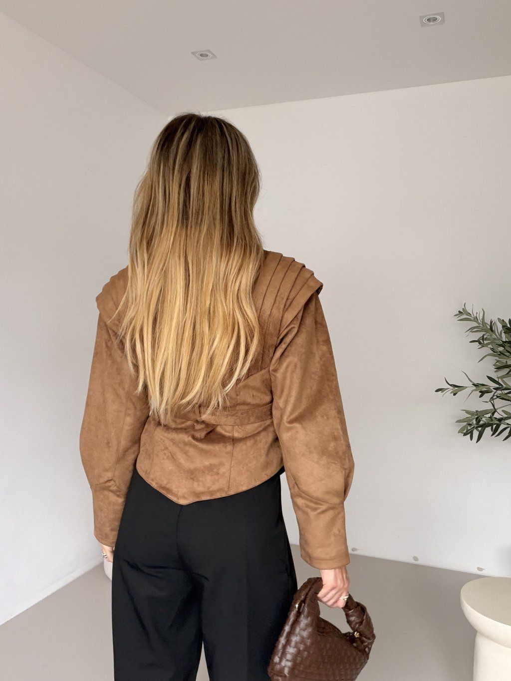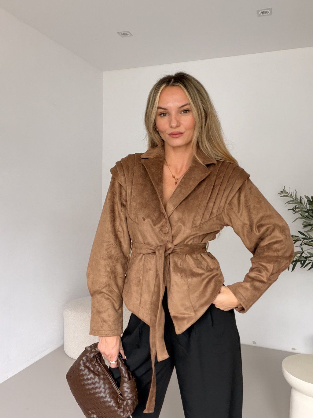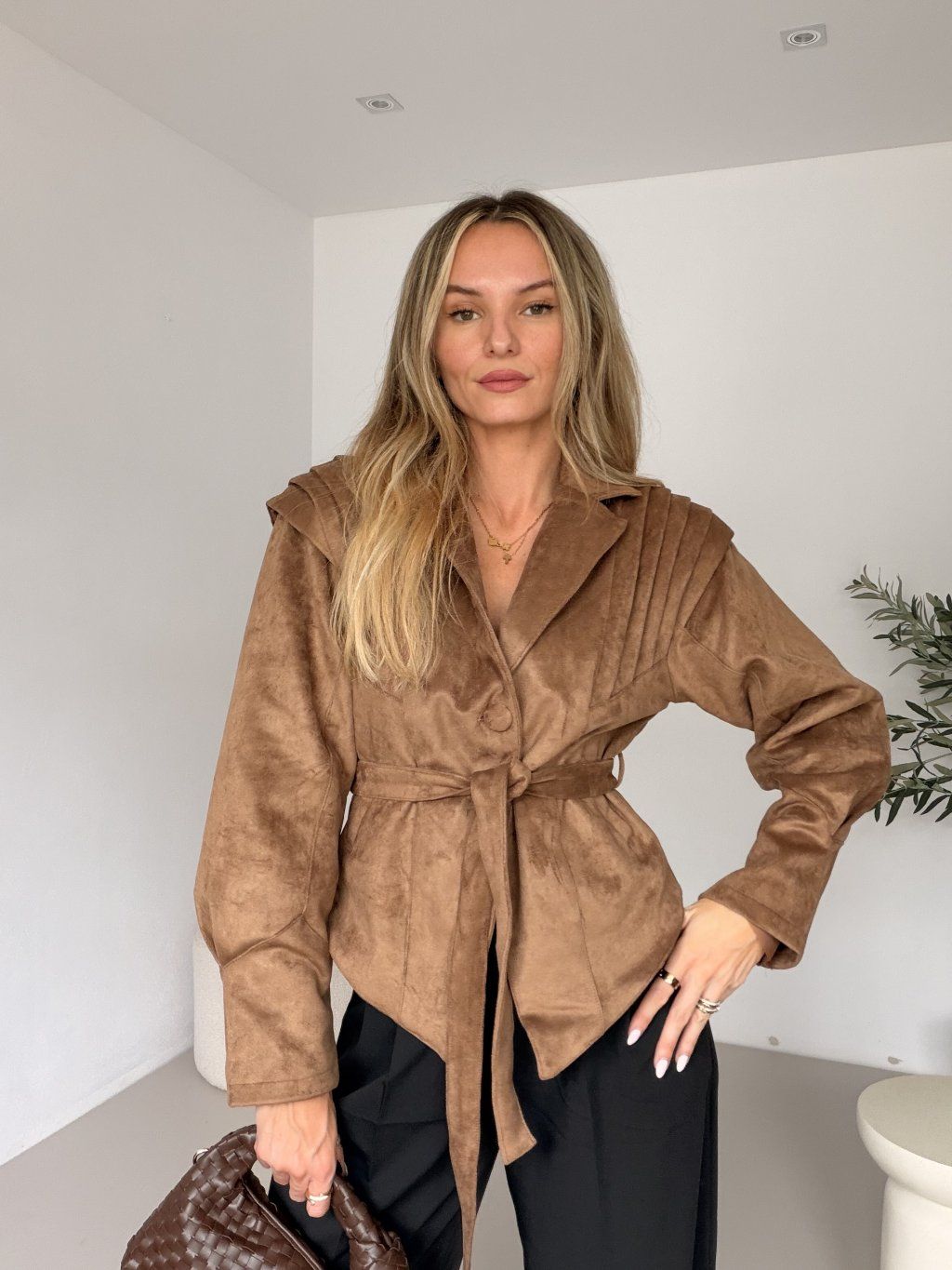 Semišový kabátek FABIANO v camel barvě je přesně ten kousek, který dodá outfitu šmrnc bez zbytečné námahy. Ramenní vycpávky a hebký semišový materiál působí luxusně a zároveň je příjemný na nošení. Díky zapínání na knoflík a možnosti stažení v pase si ho krásně přizpůsobíš své postavě a vytvoříš ženskou siluetu. Dlouhé rukávy z něj dělají ideální volbu na přechodné období – hodí se jak k džínům, tak přes šaty nebo sukni. Nadčasový kousek, který budeš nosit sezónu za sezónou. 🤎