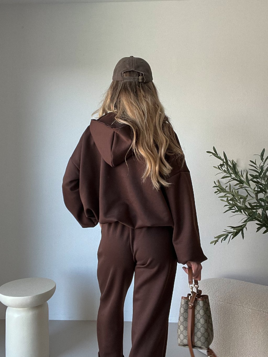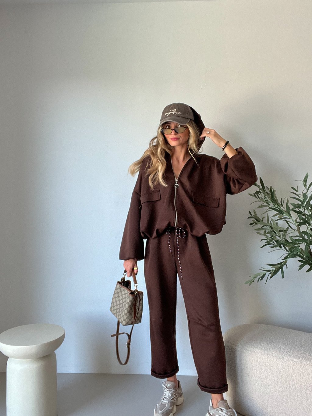 Pohodlí, které baví! Teplákový komplet AURI v hnědé barvě kombinuje ležérní styl s praktickým střihem. Baggy kalhoty s gumovým patentem v pase a vázáním na šňůrku mají boční kapsy a volný střih, takže se v nich budeš pohybovat skvěle celý den. Mikina na zip s kapucí doplňuje outfit o moderní nádech. Dvě přední kapsy na prsou, 3/4 nabírané rukávy a nabíraný střih v pase dávají celku jemnou hravost a ženský tvar, aniž by se ztrácelo pohodlí. Ideální volnočasový set, který si oblíbíš pro každý den doma i venku!