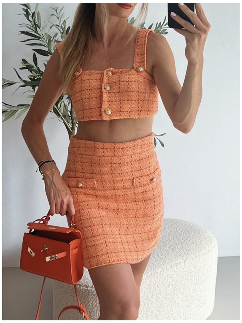 Tvídový komplet LUX v krásné meruňkové barvě - minisukně do pasu a crop tílko. Nádherný originální kousek, který je doplněn výraznými zlatými knoflíčky.