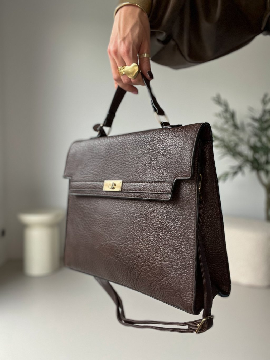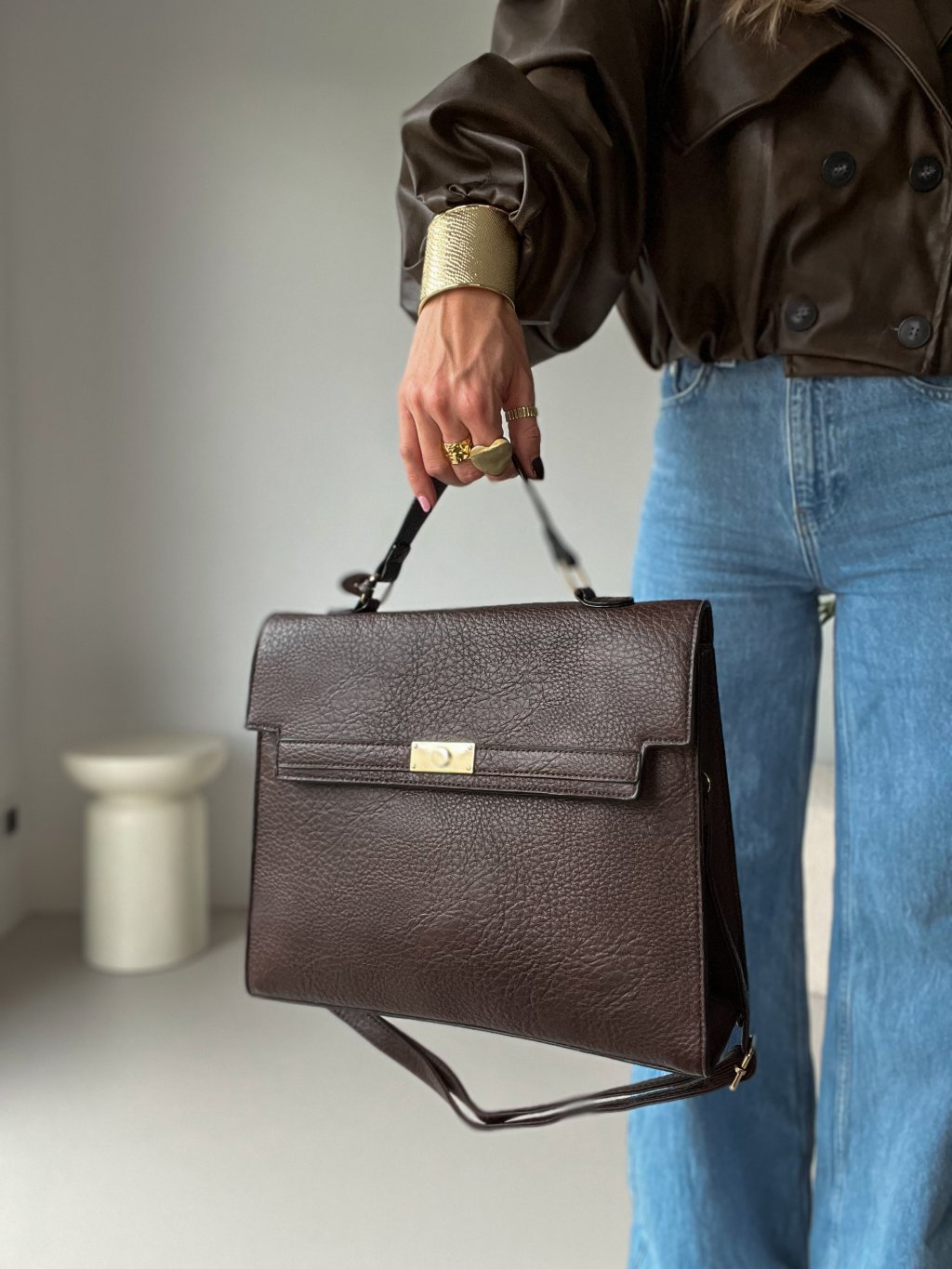 Elegantní kabelka DARNEL ve tvaru kufříku je nadčasovým doplňkem pro každý den. Vyrobená z kvalitní eko kůže v teplém, tmavě hnědém odstínu, se zlatým detailem na zapínání. Působí jemně, ale výrazně zároveň. Krátké ucho umožní nosit ji v ruce, zatímco odnímatelný dlouhý popruh ti dává možnost přehodit si ji přes rameno a mít tak volné ruce – třeba při cestách po městě. Praktická zadní kapsa navíc schová vše, co chceš mít po ruce. Kabelka, která se hodí k džínům i šatům, do práce i na rande – a z každého dne udělá o něco stylovější moment.