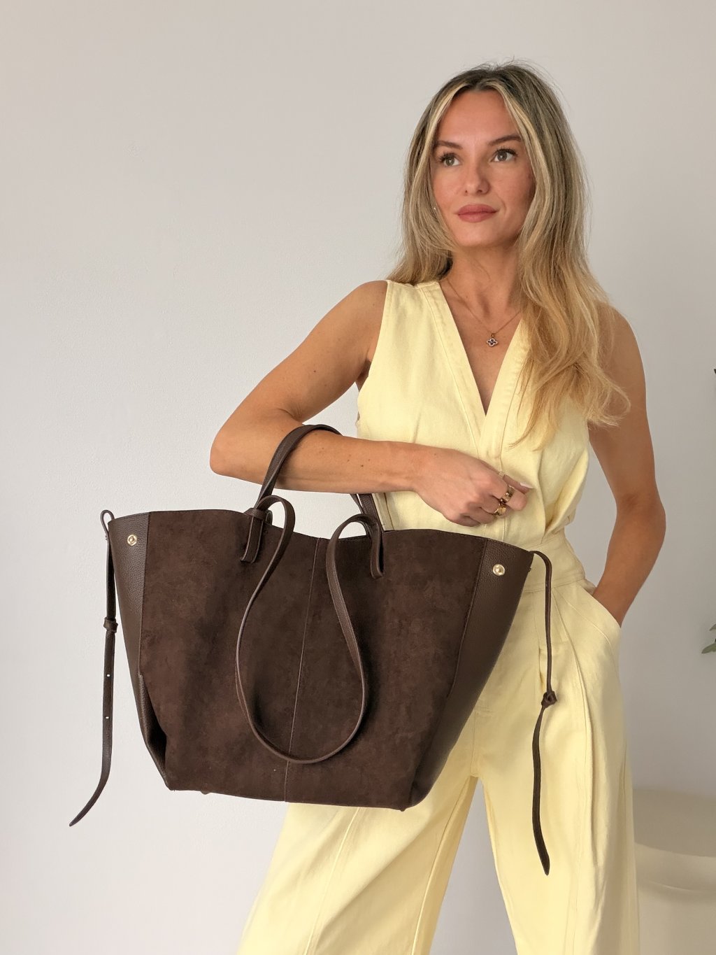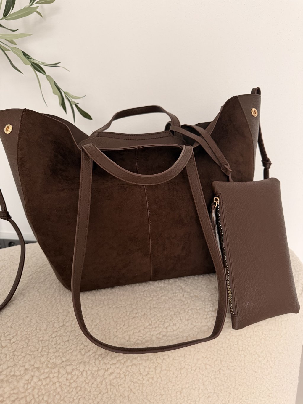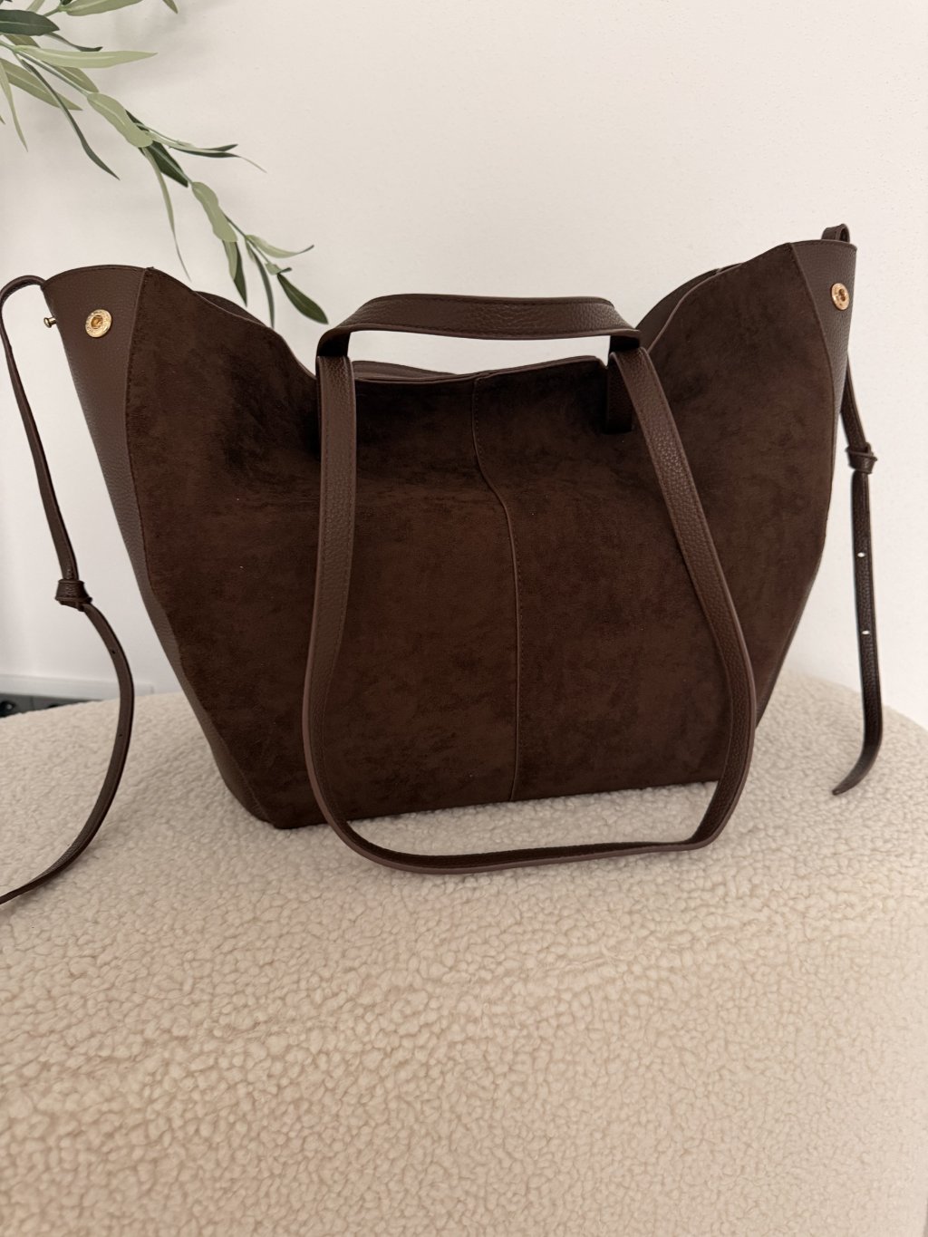 Velká semišová kabelka DENISSE v nádherné hnědé barvě je dokonalým spojením elegance a praktičnosti. Svým minimalistickým designem a čistými liniemi připomíná luxusní styl oblíbených designérských kabelek, díky čemuž působí velmi sofistikovaně a nadčasově. Kabelka má krátká ucha do ruky i dlouhý popruhy přes rameno, takže si ji můžeš přizpůsobit přesně podle svého stylu a příležitosti. Je ideální jak do práce, tak i na každodenní nošení. Velkým benefitem je variabilní tvar – díky možnosti odepnutí na bocích si můžeš kabelku upravit do dvou podob. Pro elegantní, kompaktní vzhled zvolíš kulatější tvar, nebo ji rozepneš do širšího „loďkového“ stylu, čímž získáš více prostoru. DENISSE je stylový a praktický kousek, který snadno sladíš s jakýmkoliv outfitem a stane se tvým každodenním favoritem. 🤎✨
