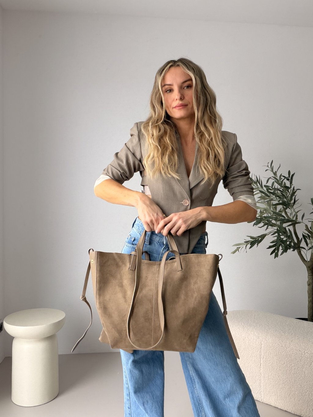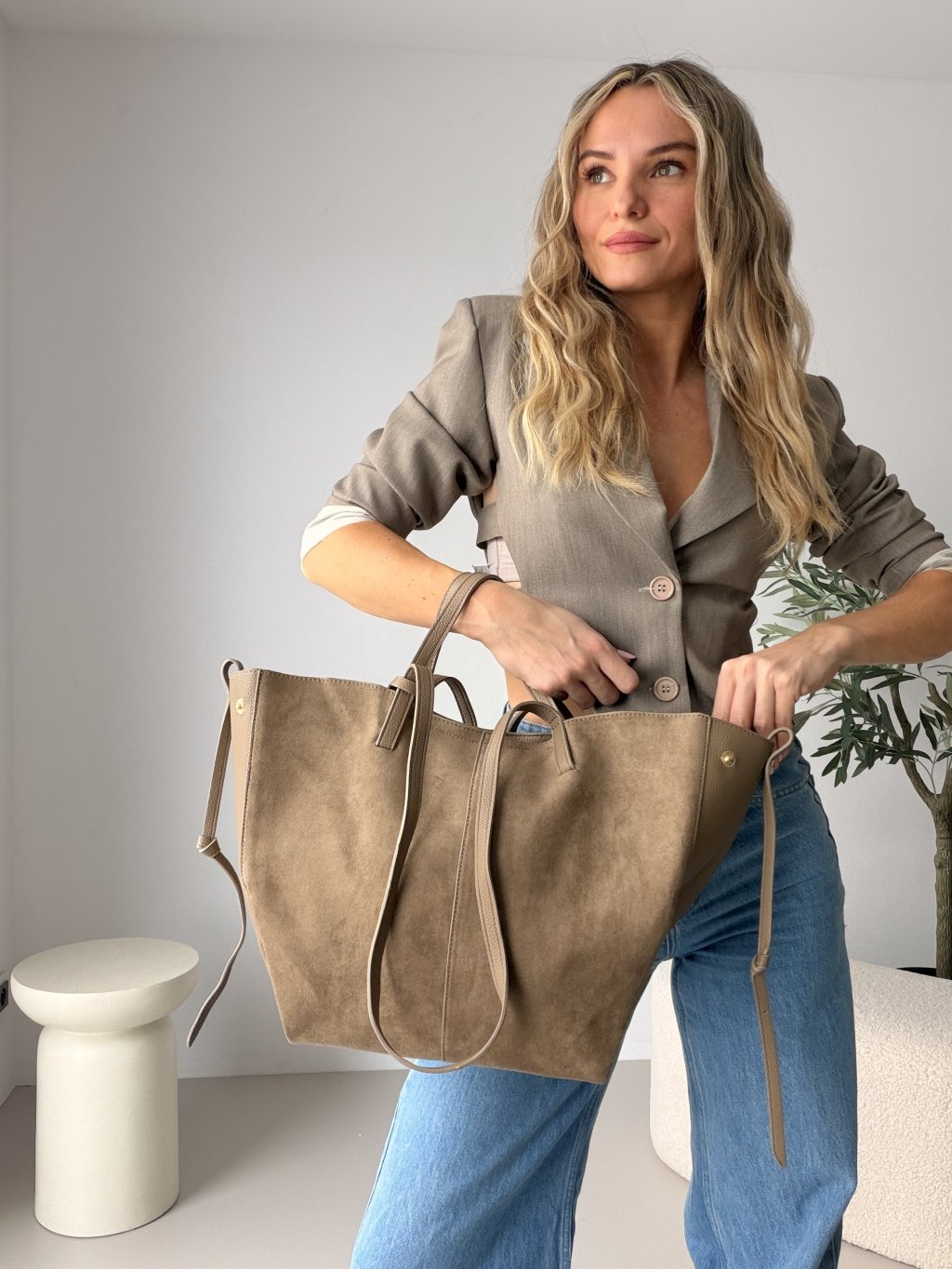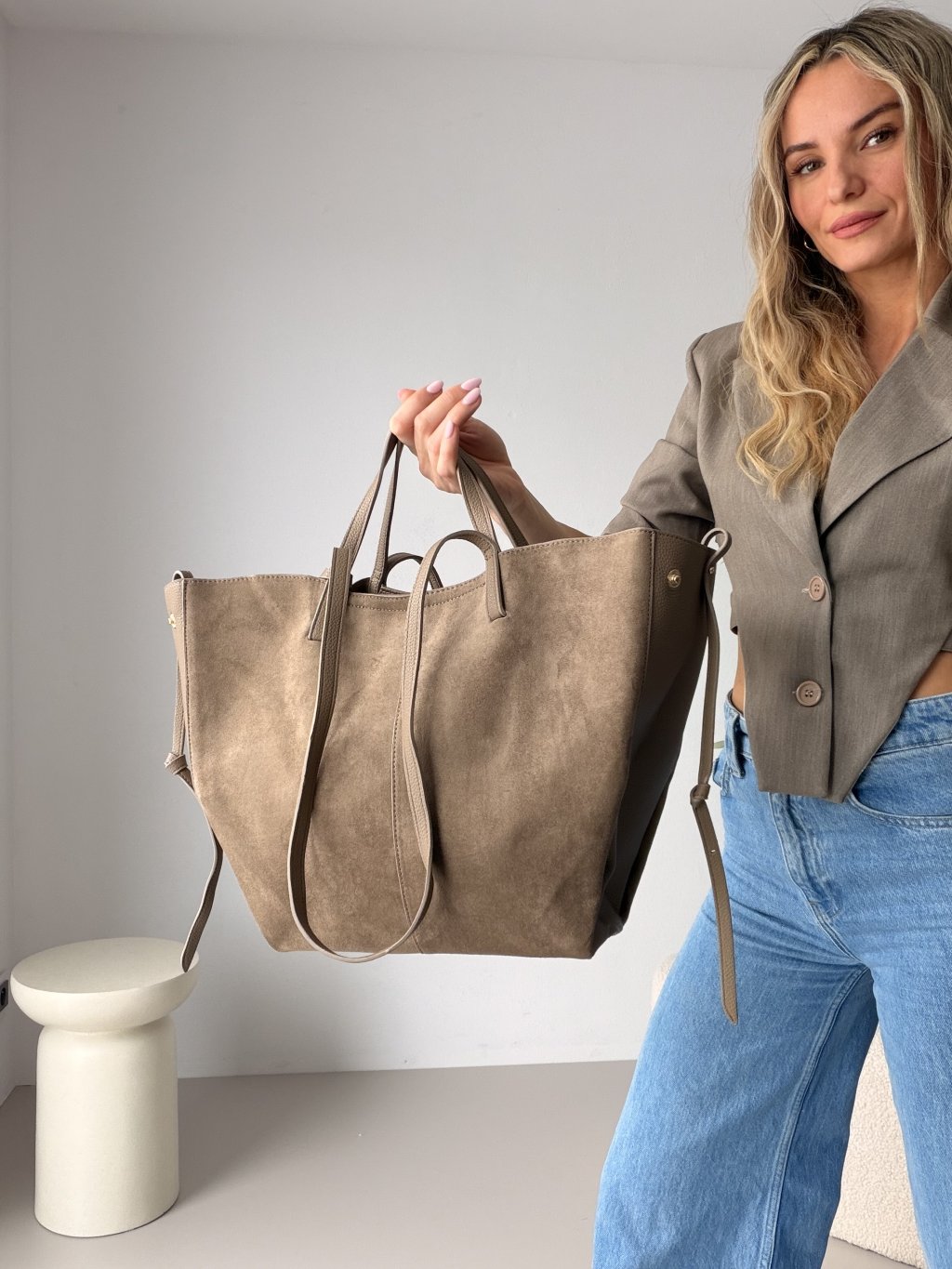 Velká semišová kabelka DENISSE v nádherné taupe barvě je dokonalým spojením elegance a praktičnosti. Svým minimalistickým designem a čistými liniemi připomíná luxusní styl oblíbených designérských kabelek, díky čemuž působí velmi sofistikovaně a nadčasově. Kabelka má krátká ucha do ruky i dlouhý popruhy přes rameno, takže si ji můžeš přizpůsobit přesně podle svého stylu a příležitosti. Je ideální jak do práce, tak i na každodenní nošení. Velkým benefitem je variabilní tvar – díky možnosti odepnutí na bocích si můžeš kabelku upravit do dvou podob. Pro elegantní, kompaktní vzhled zvolíš kulatější tvar, nebo ji rozepneš do širšího „loďkového“ stylu, čímž získáš více prostoru. DENISSE je stylový a praktický kousek, který snadno sladíš s jakýmkoliv outfitem a stane se tvým každodenním favoritem. 🤎✨